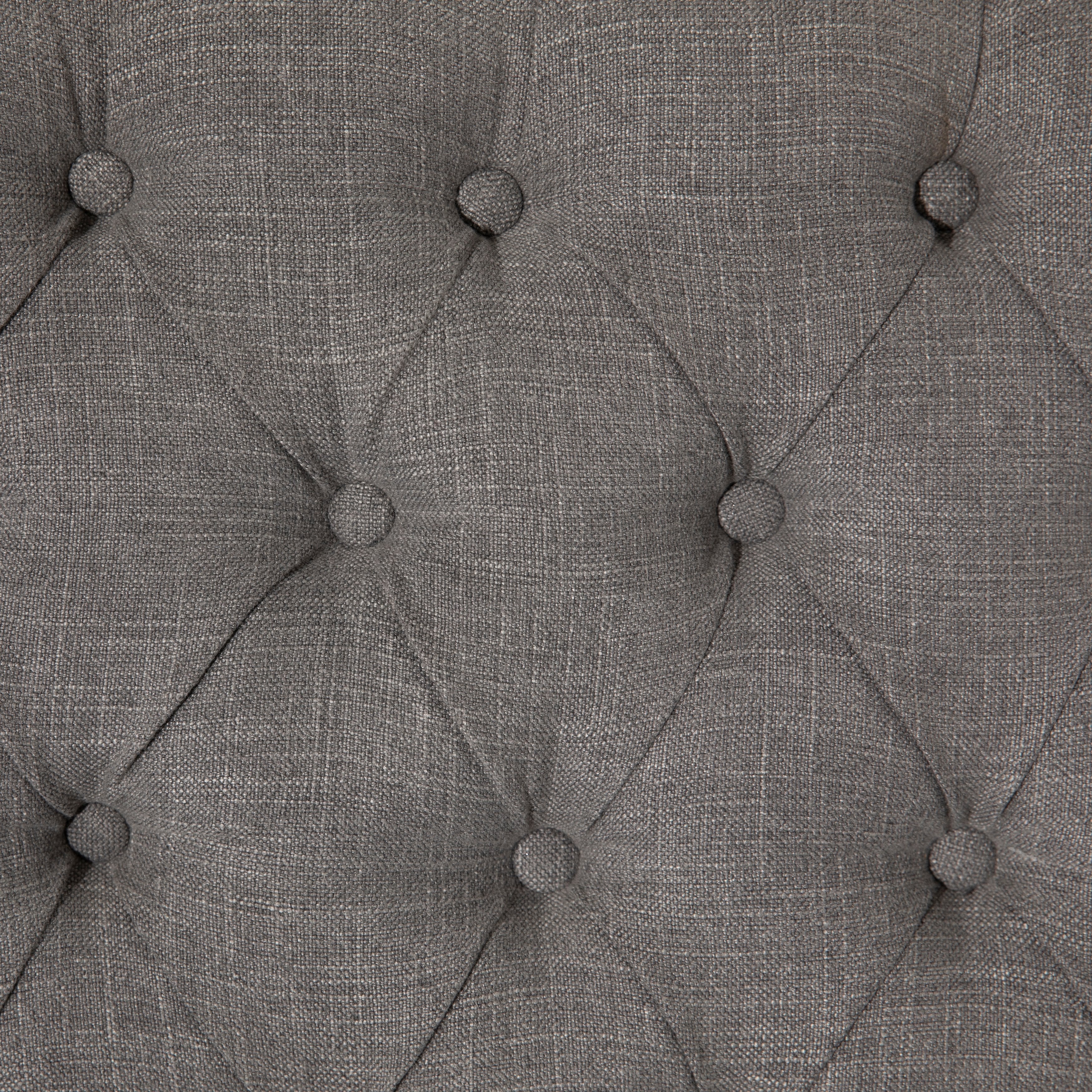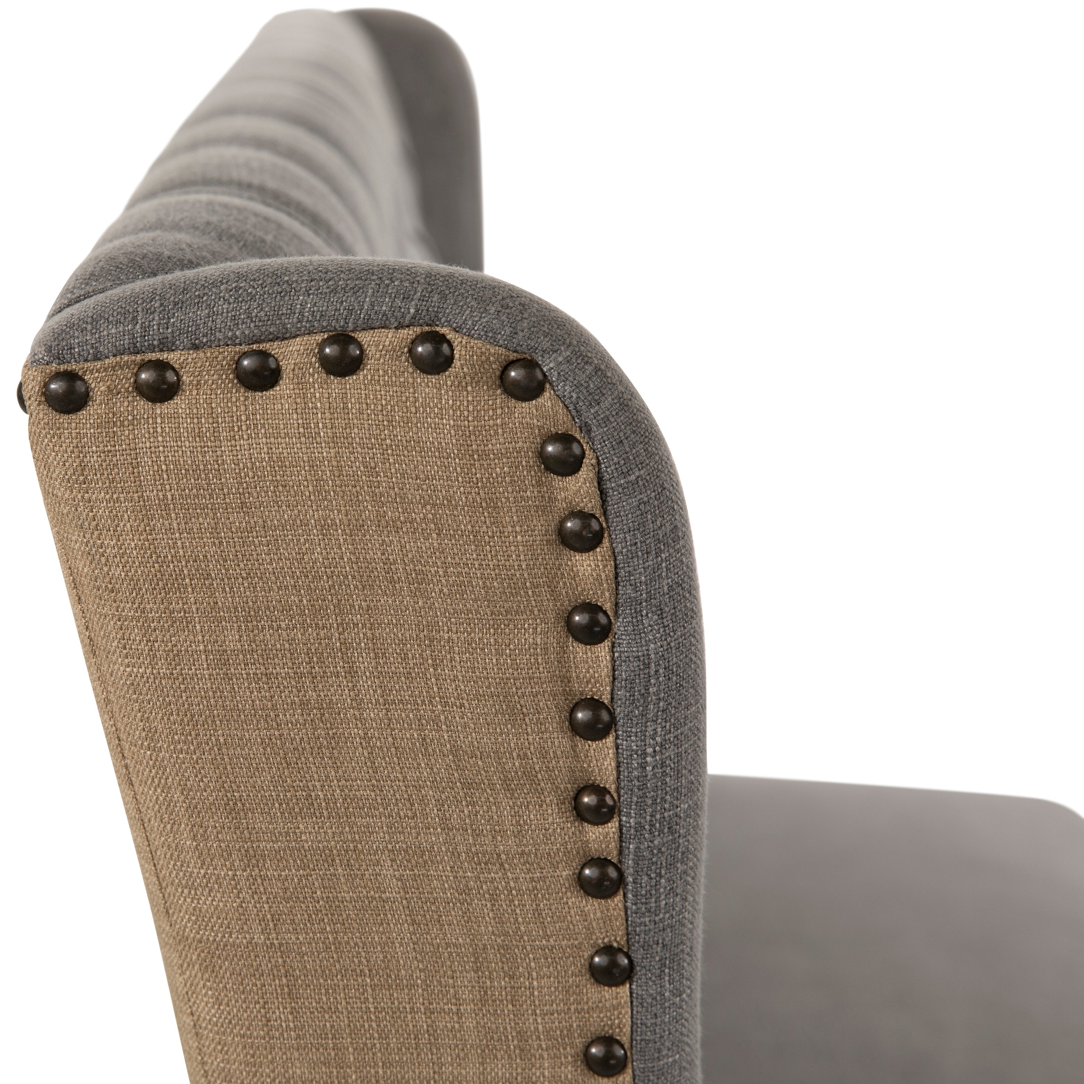 Classic charm and elegance adorn this luxurious, tufted long Dining Bench. Wrapped with a grey linen blend upholstery and light brown jute on the back, this armless dining bench features a classic wingback silhouette and a foam filled seat for extra support. Diamond tufting and nail head trim complete the tailored look and traditional feel. Featuring four tapered rubberwood legs in an antique wood finish.
