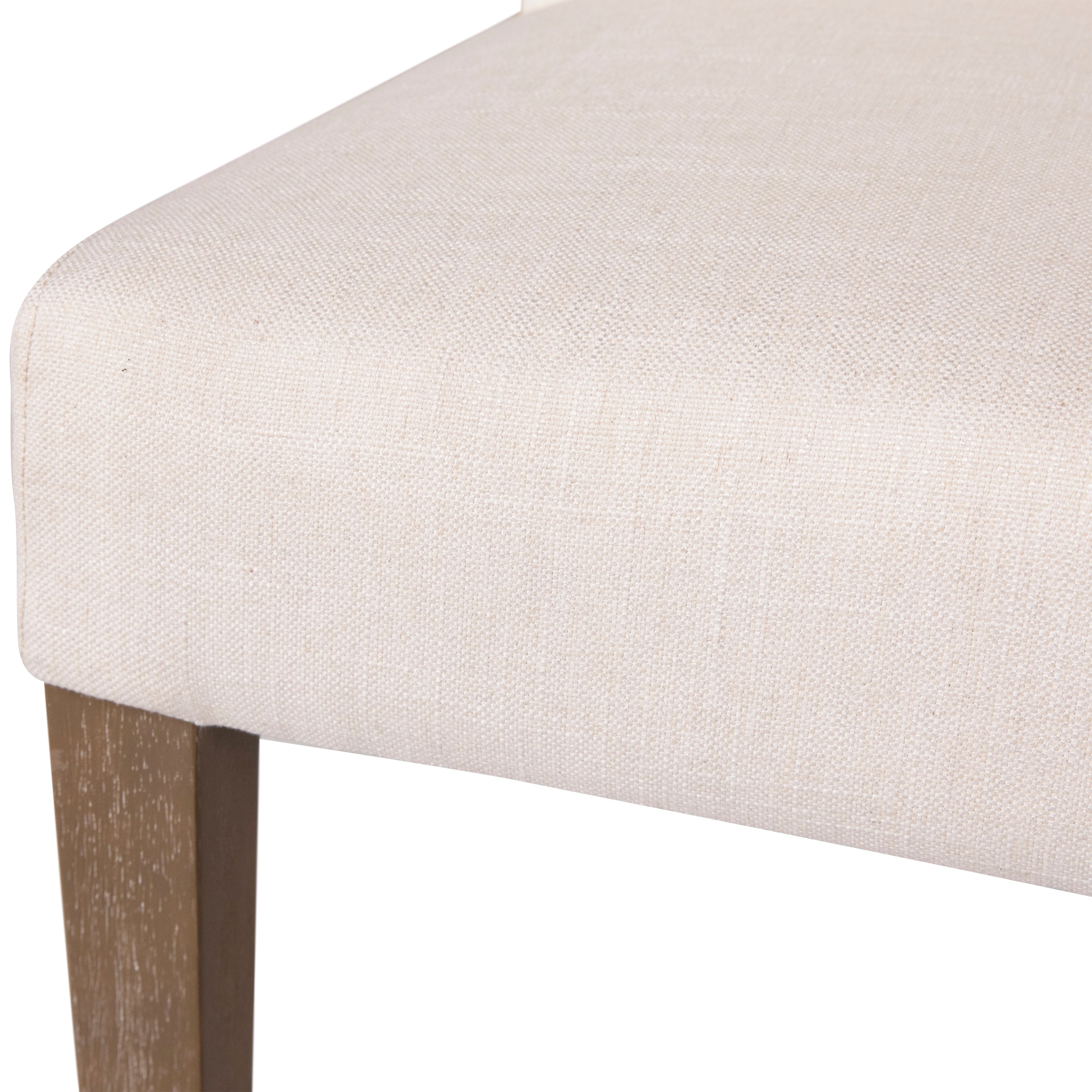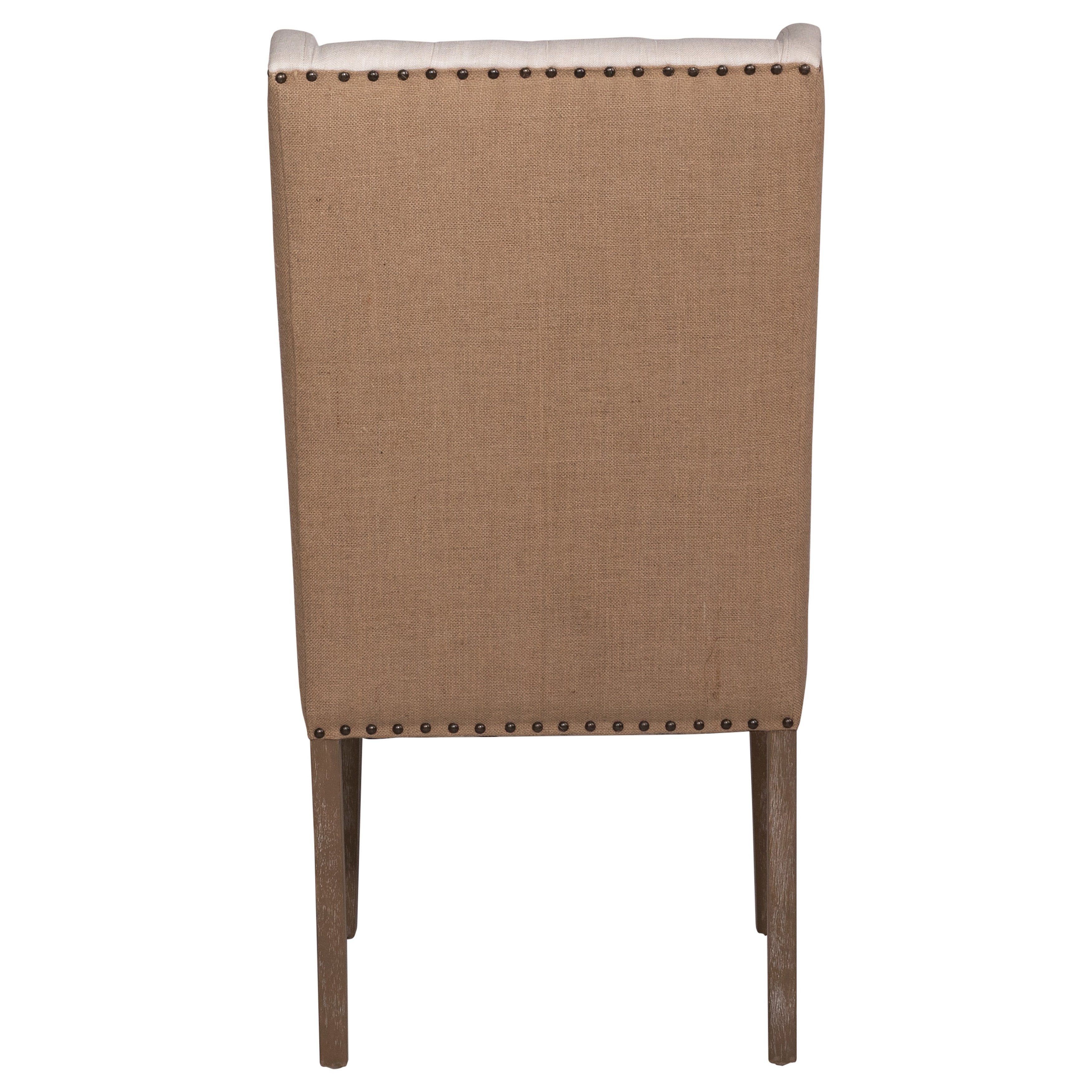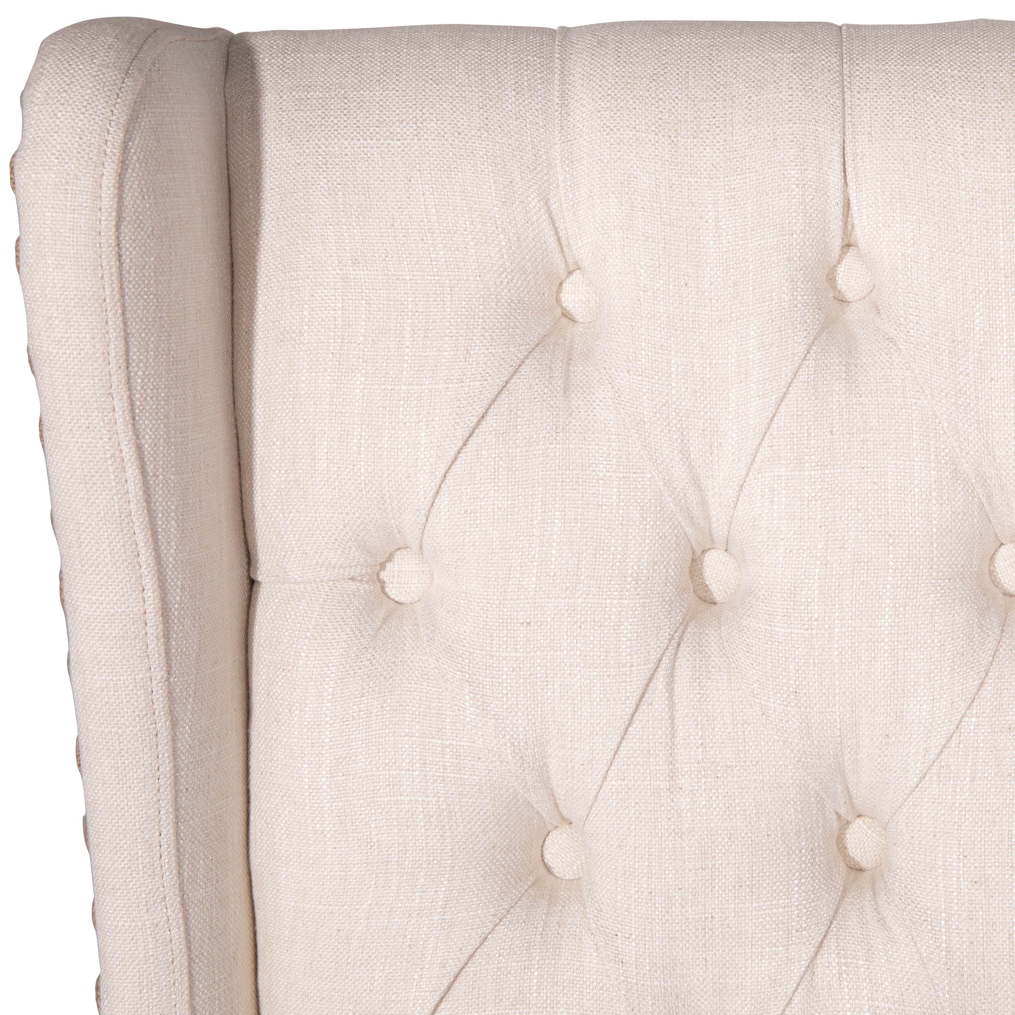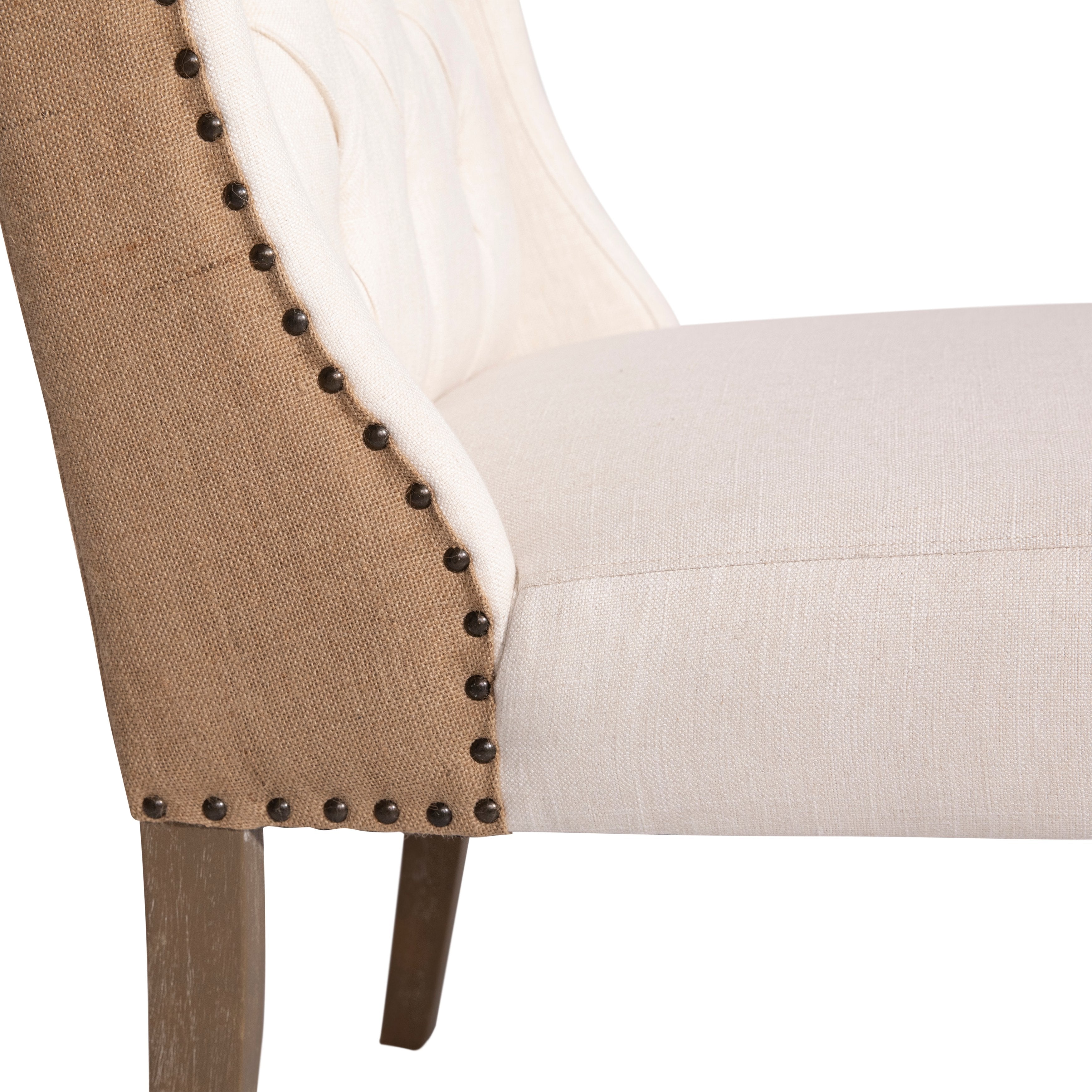 Classic charm and elegance adorn this luxurious, tufted dining chair. Wrapped with an ivory, linen blend upholstery and tan jute back, this armless dining chair features a classic wingback silhouette and a foam filled seat for extra support. Diamond tufting and nail head trim complete the tailored look and traditional feel. Featuring four tapered rubberwood legs in an antique wood finish.