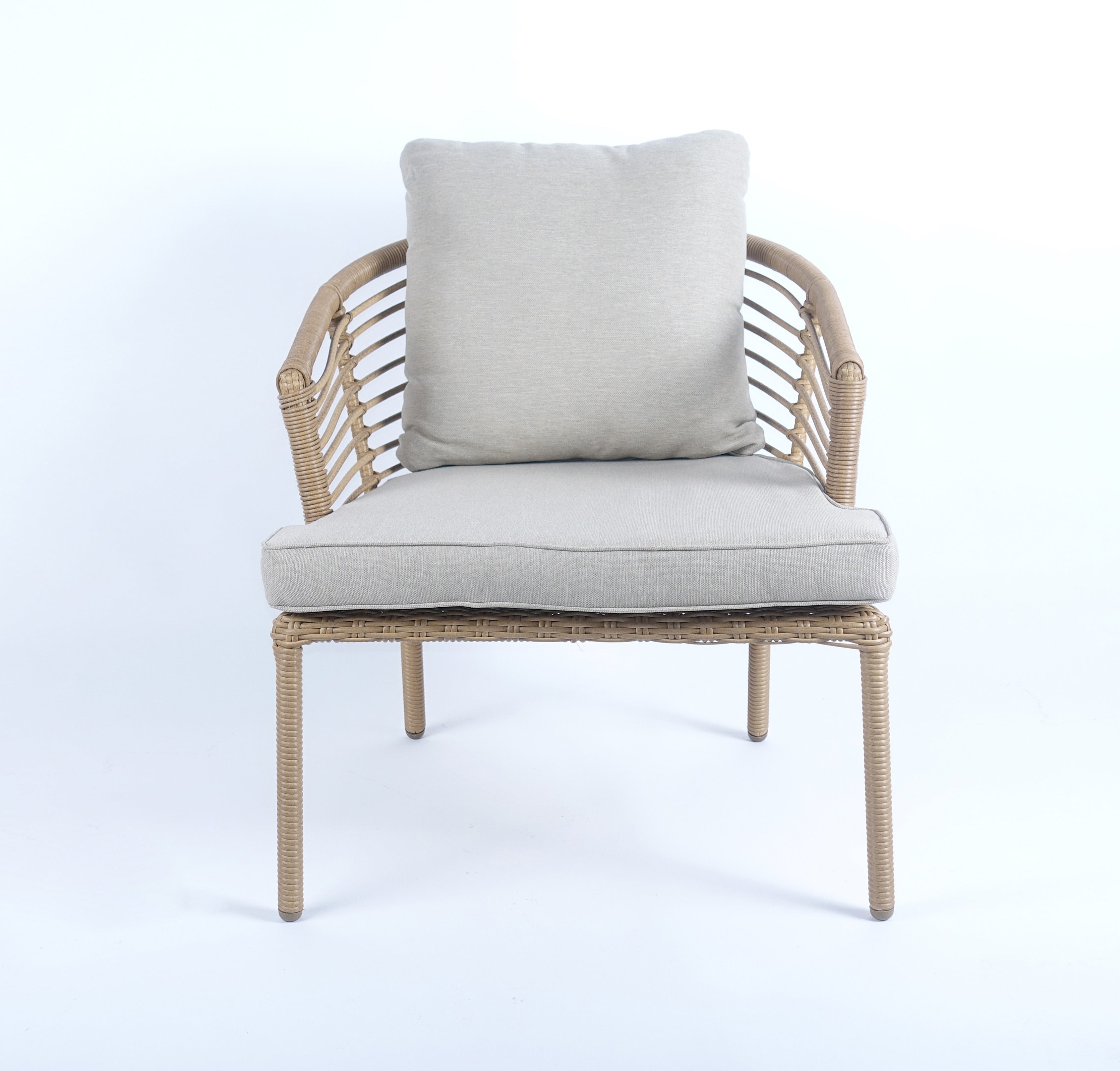 Enjoy the leisure of the outdoors with the Salermo outdoor set. This convenient package includes two chairs and coffee table. The frame of the chair is composed of lightweight aluminum. while the table top is made from grey concrete. White cushions and weaved wicker support you as you relax with a glass of wine on a lazy Sunday.