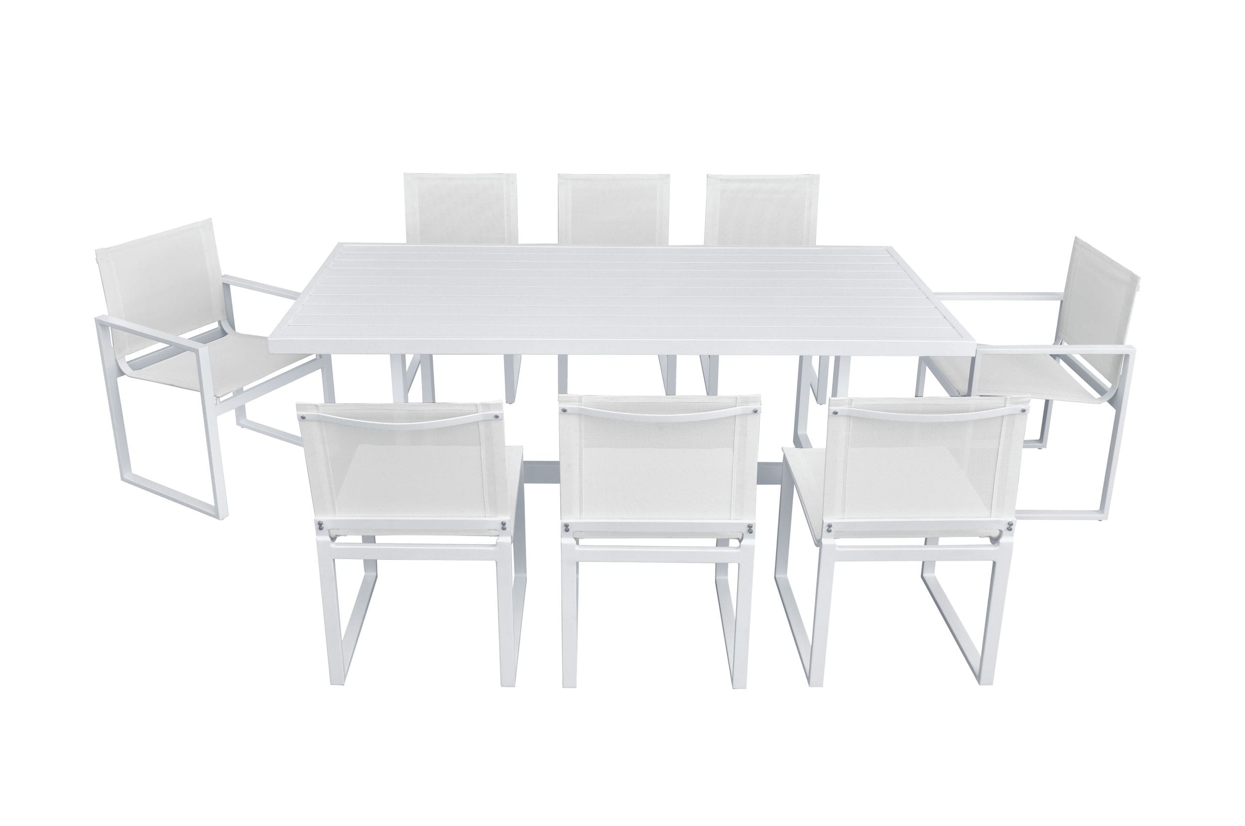 Simple and clean lines give the Renava Wake & Kayak Modern Outdoor DIning Set. The Wake Table is the perfect center piece to complete your outdoor dining set. The white aluminum metal that makes up the structure of this table is lightweight and capable of resisting the weather. The striking color and modern lines make this a perfect set for a modern or contemporary home. The two Kayak Outdoor Armchairs are placed at the ends of the table while the (armless) Kayak Outdoor Chairs bring the total seating arrangement up to 8.