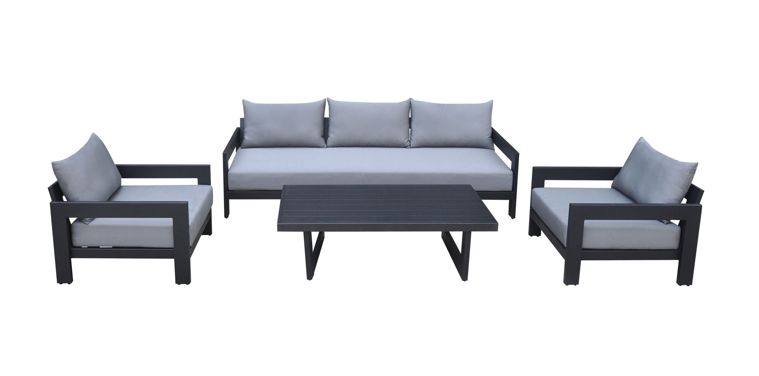 Our Renava Wake Outdoor Sofa Set is designed to be comfortable, inviting and durable. The grey removable cushions are made of water resistant fabric to protect against the elements. The frame is built from aluminum with a charcoal powder coating to provide a pleasing visual. Two chairs combine with the sofa and coffee table to create a cozy chat set perfect for any patio or poolside outdoor event.