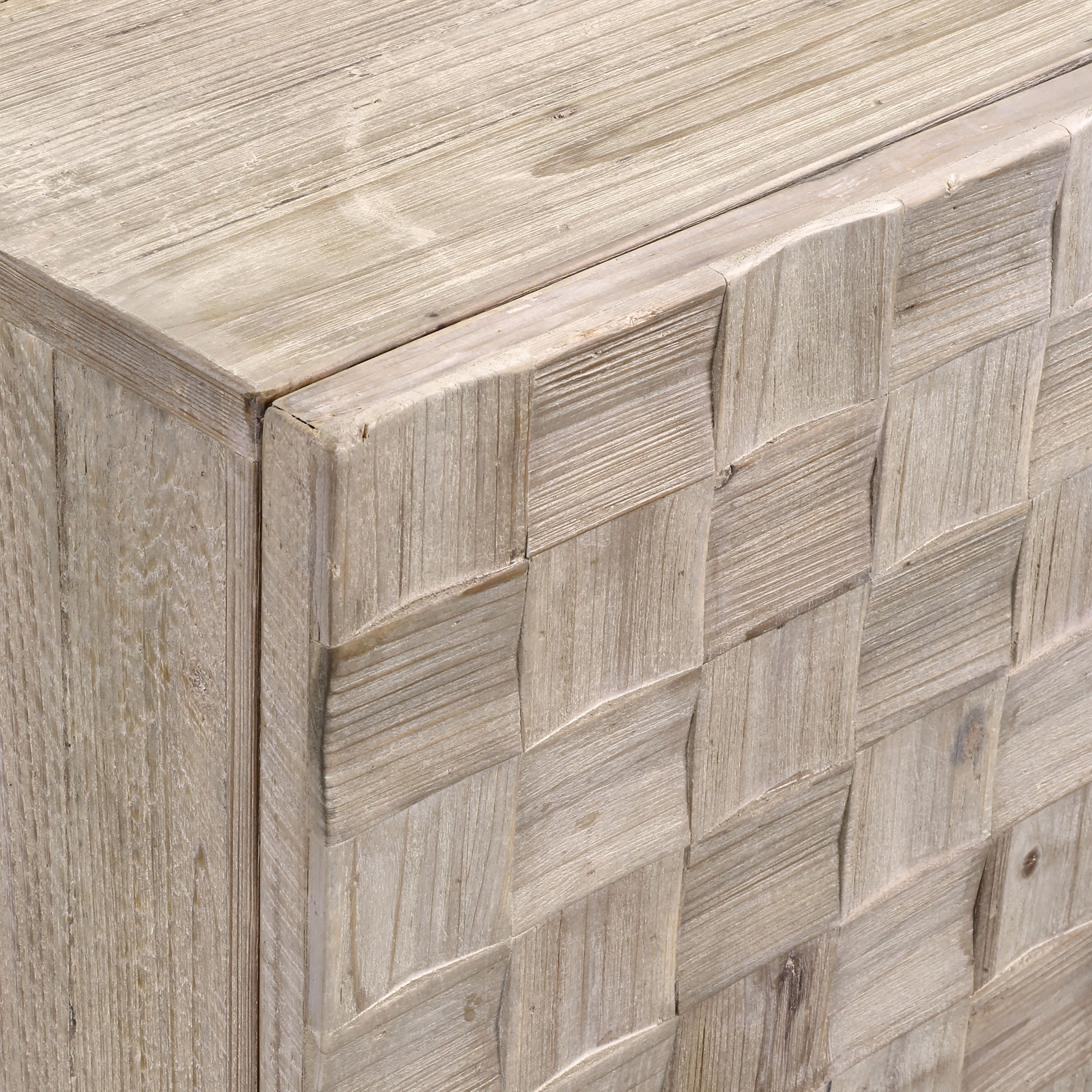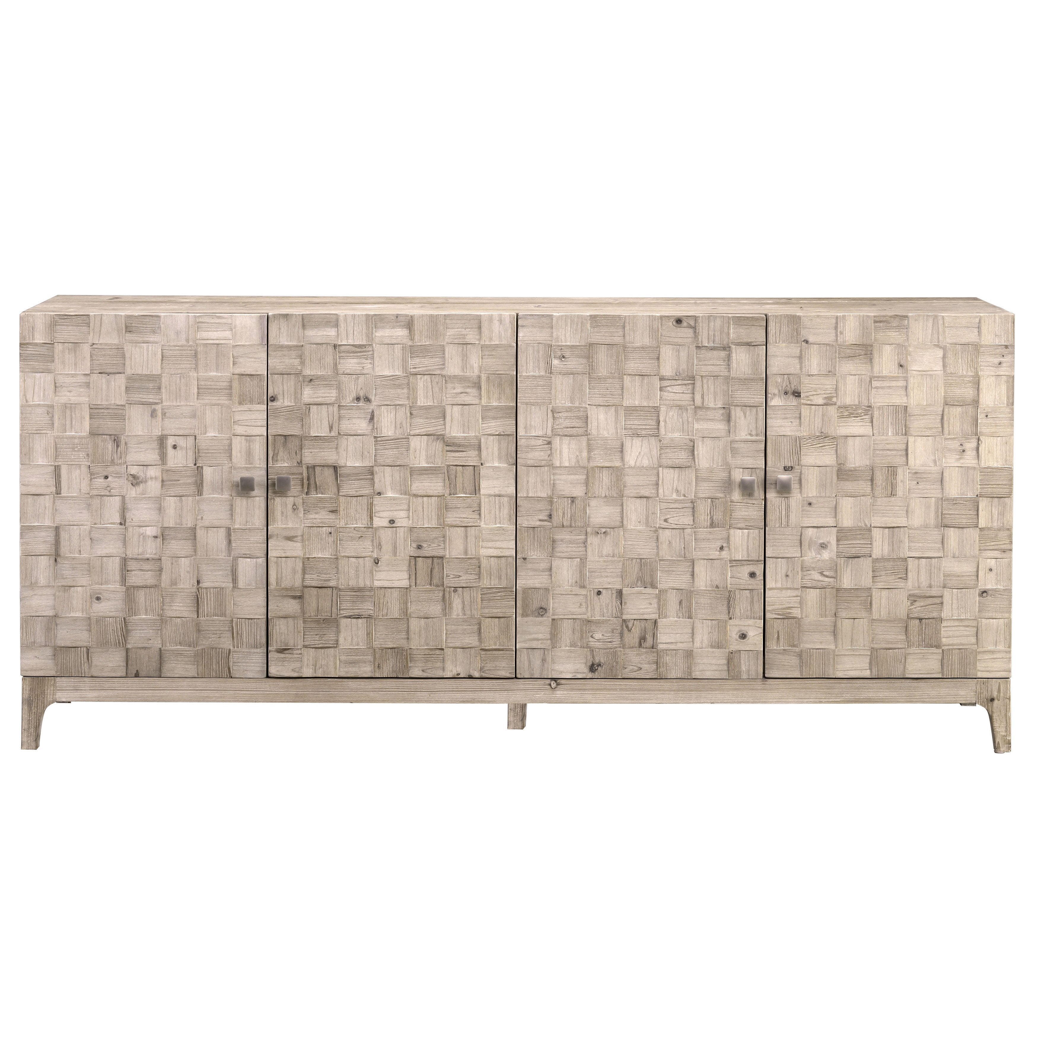 This uniquely designed sideboard will be a design favorite featuring a heavy reclaimed Pine hardwood construction with 3-D basket weave designed hand carved door front detailing finished in a light grey wash to bring out the grain and detailing of the hardwood. Each set of butterfly doors open to a large storage cabinet space with two shelves for ample storage solutions. This piece will make a beautiful addition to any room.