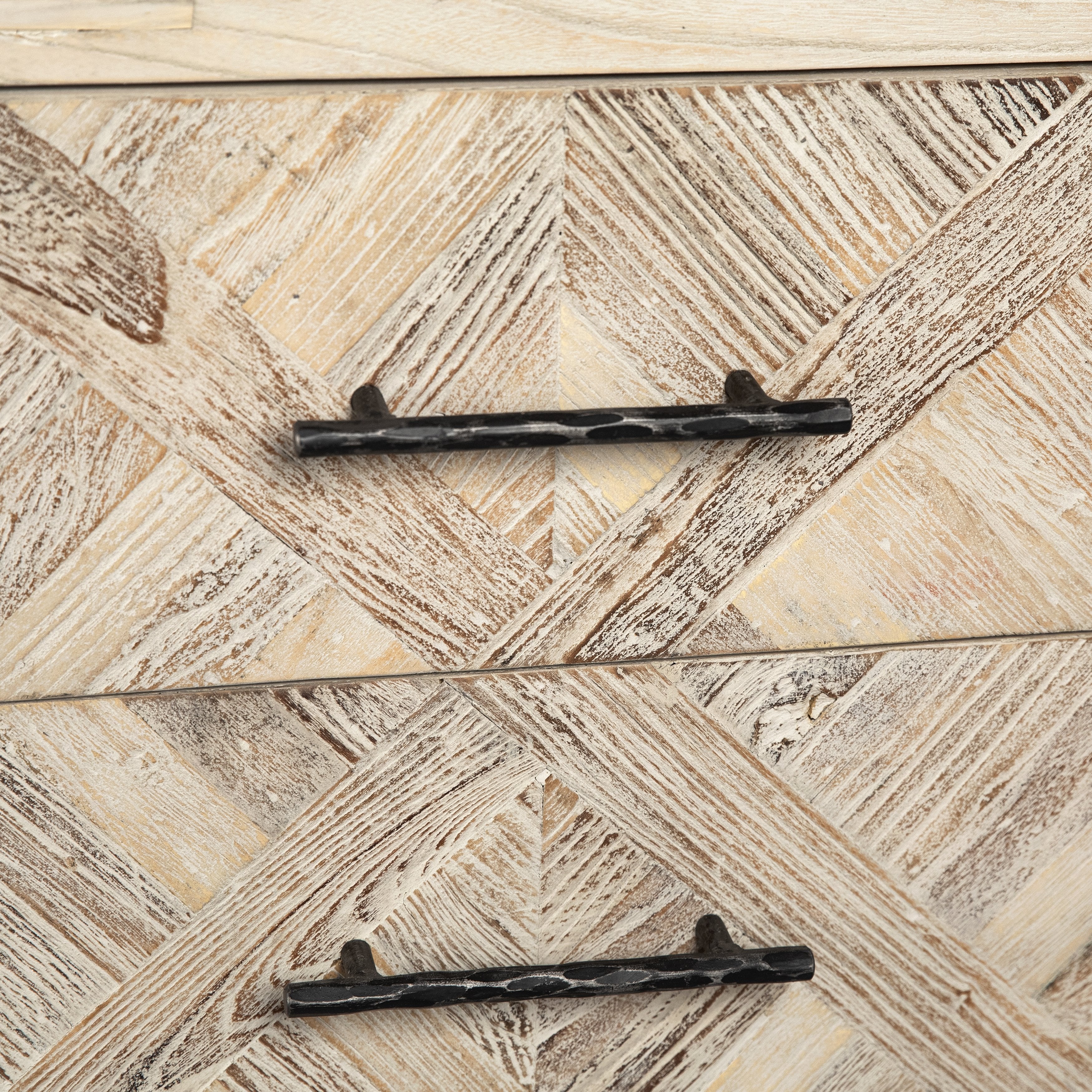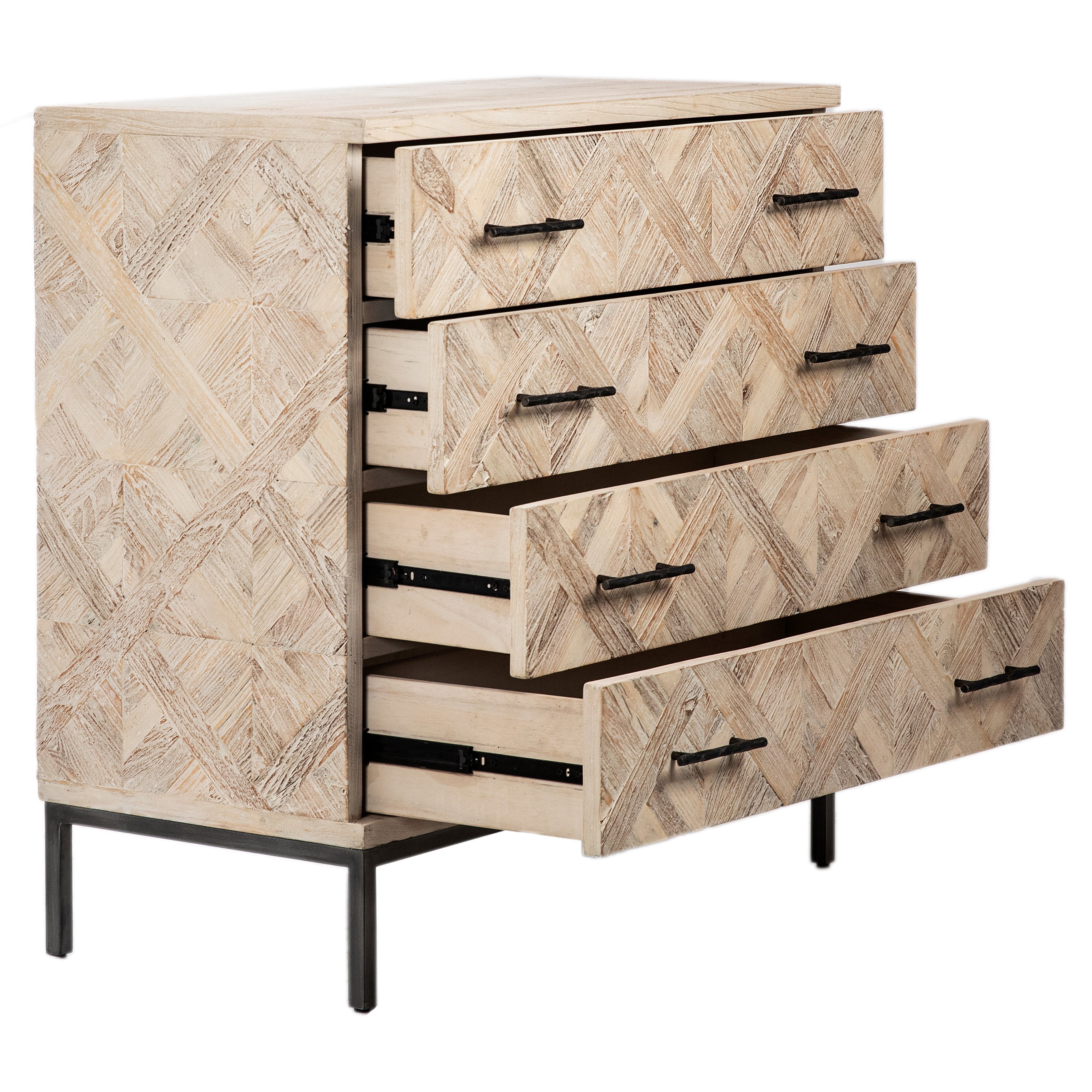 With its clean lines and natural wood tones, this 41 chest is a stylish addition to any space. Made from reclaimed elm wood with a mismatched crisscross look for an artisan vibe we love, plus a light warm was finish that shows off the woods grain variation. The four drawers are finished off with double hand forged iron, black bar pulls that combine both rustic and industrial styles.