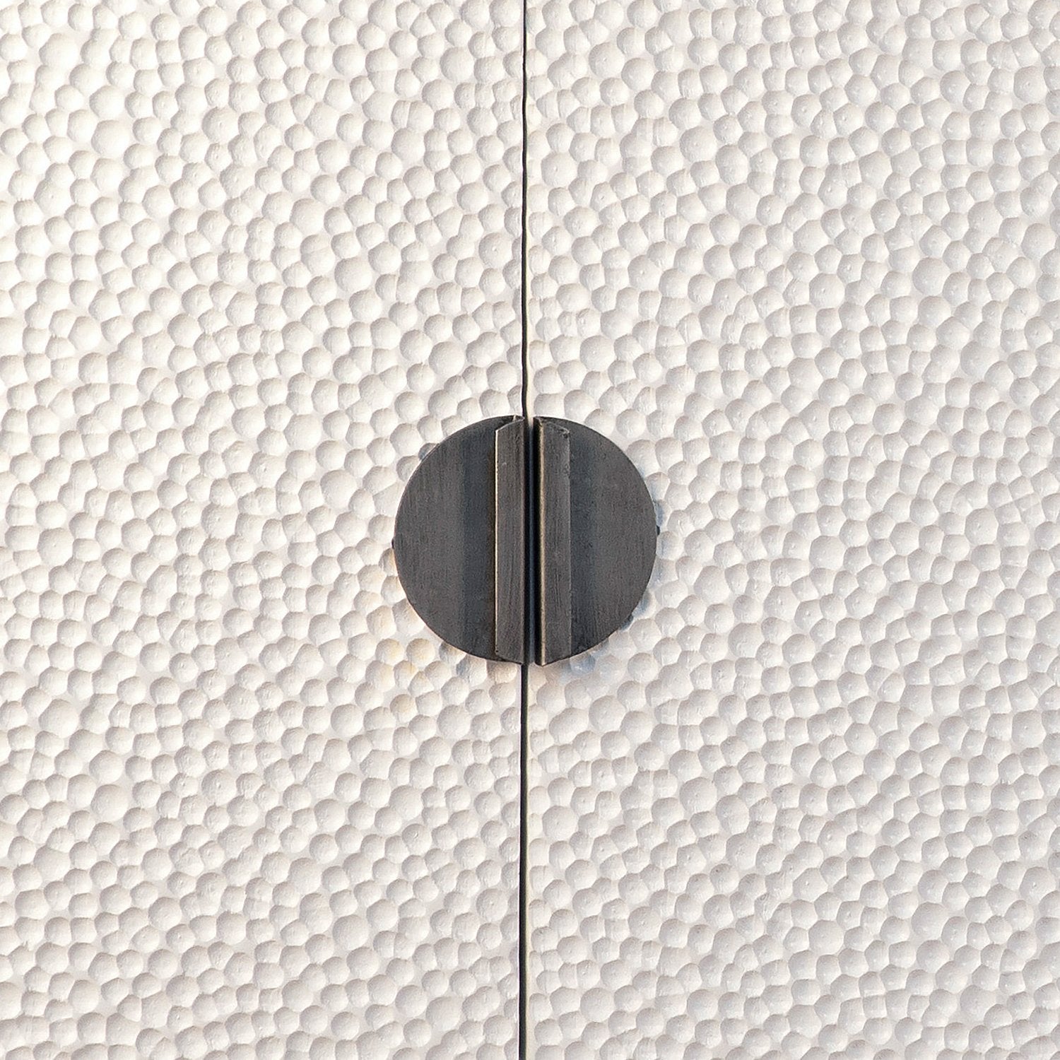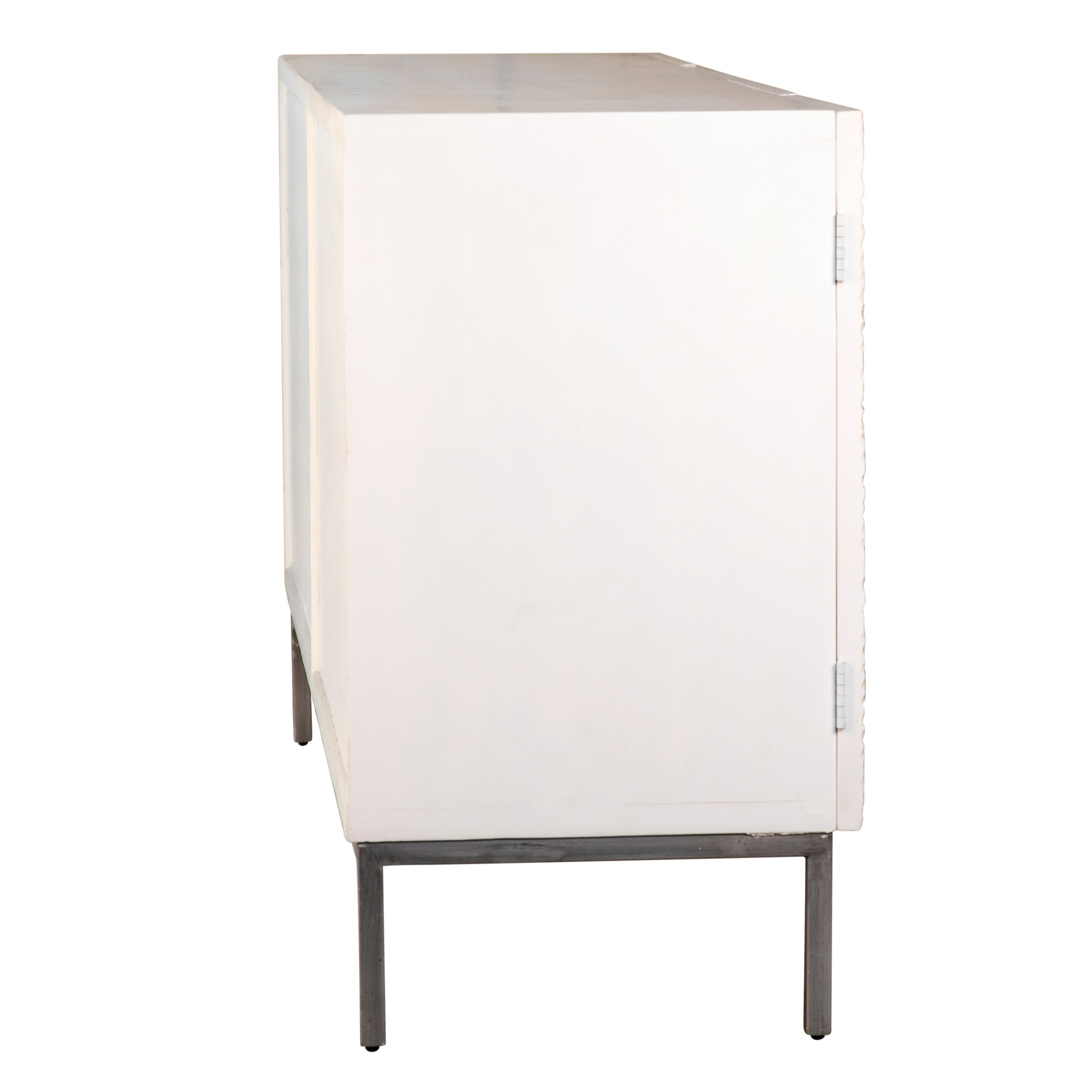 Give guests something to talk about with this beautiful 79" Sandwell Sideboard. Made of reclaimed pine wood and finished in a bright white, the unique door-front texture will beg to be touched. The four door fronts are complimented by striking semi-circular sand blasted iron handles for easy opening. The interior boasts two large storage shelves for all your entertainment needs.