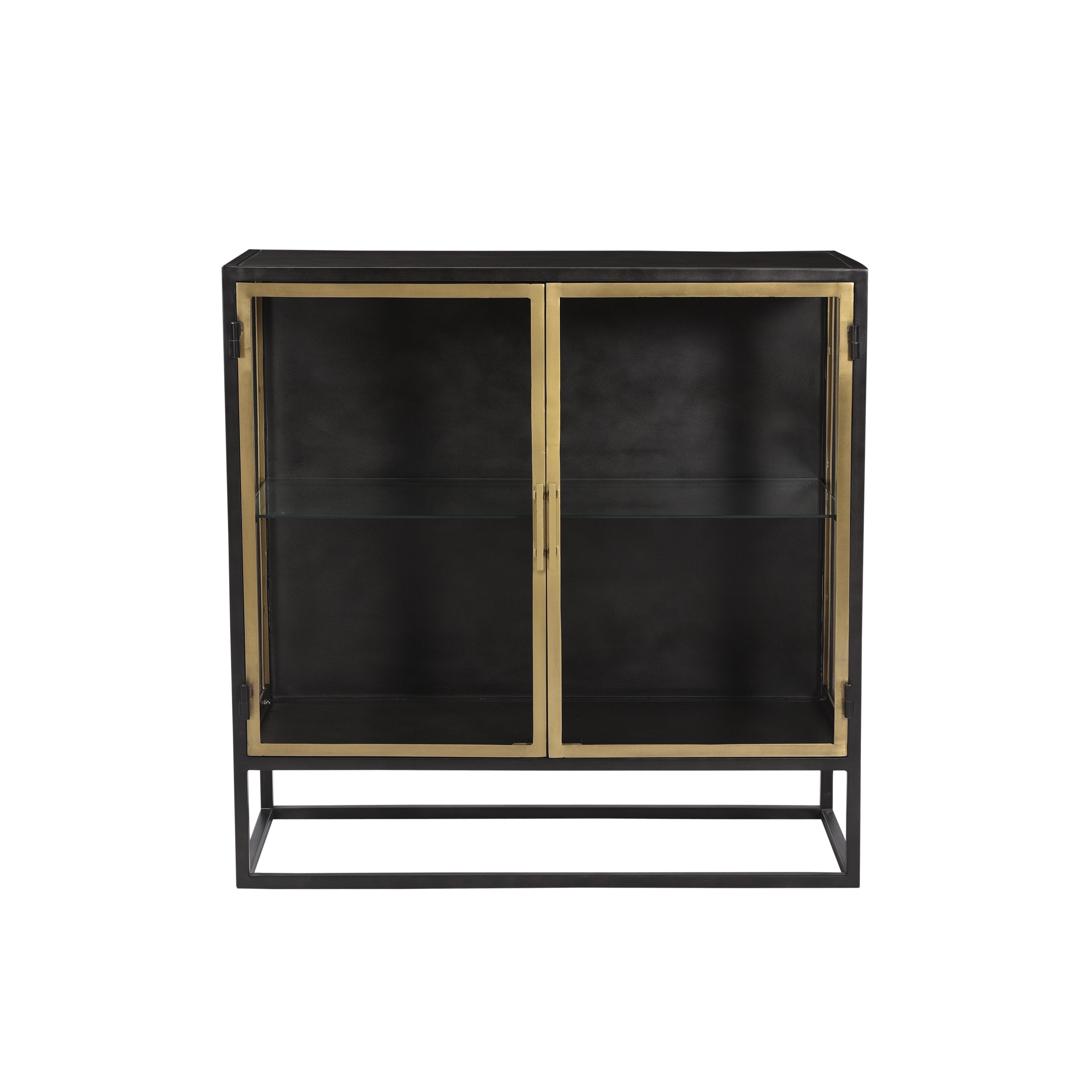 A shadowbox-inspired 2- Door sideboard, featuring a gunmetal finished frame and antique brass accents for contrast. Our handsome modern industrial sideboard is ideal for displaying prized pieces.
