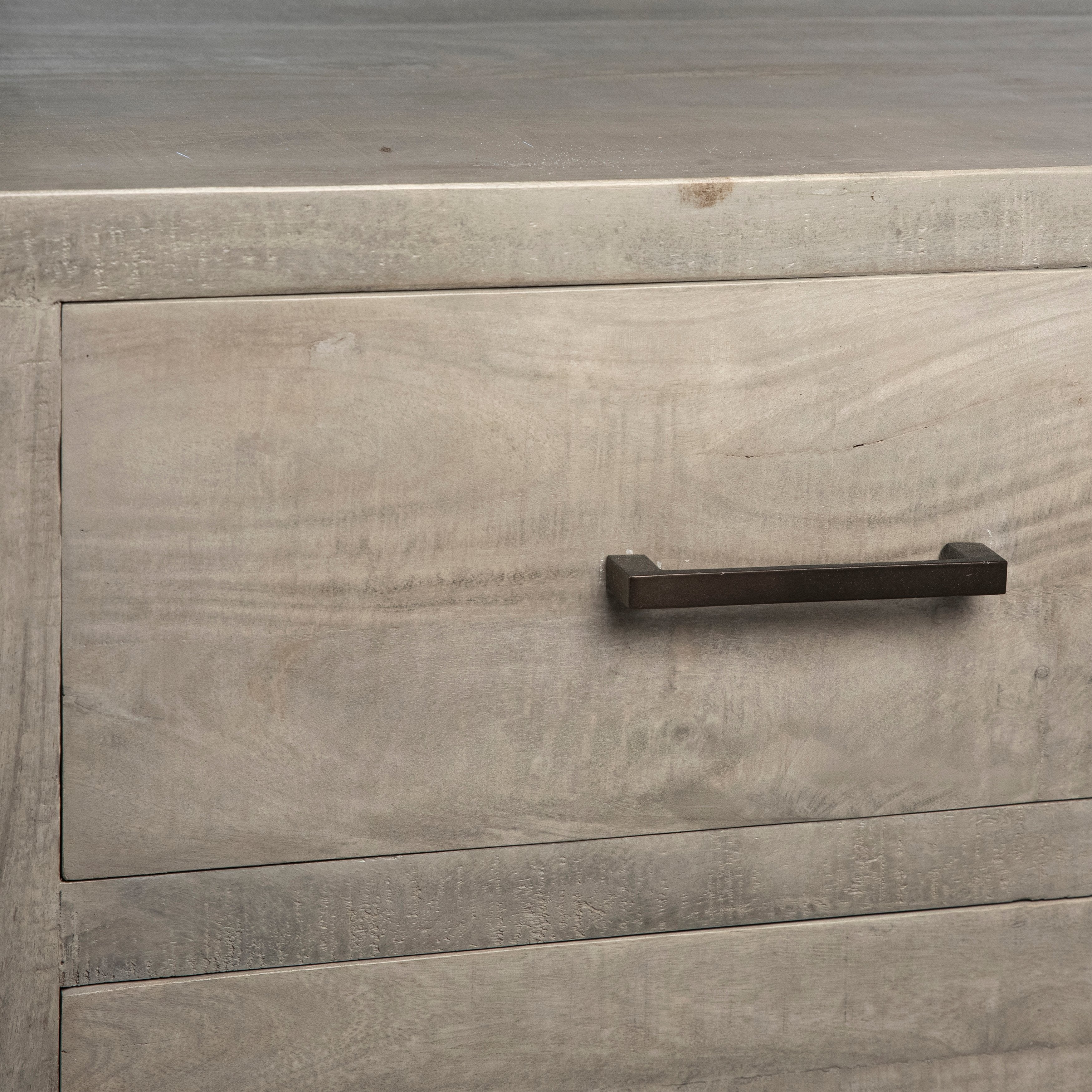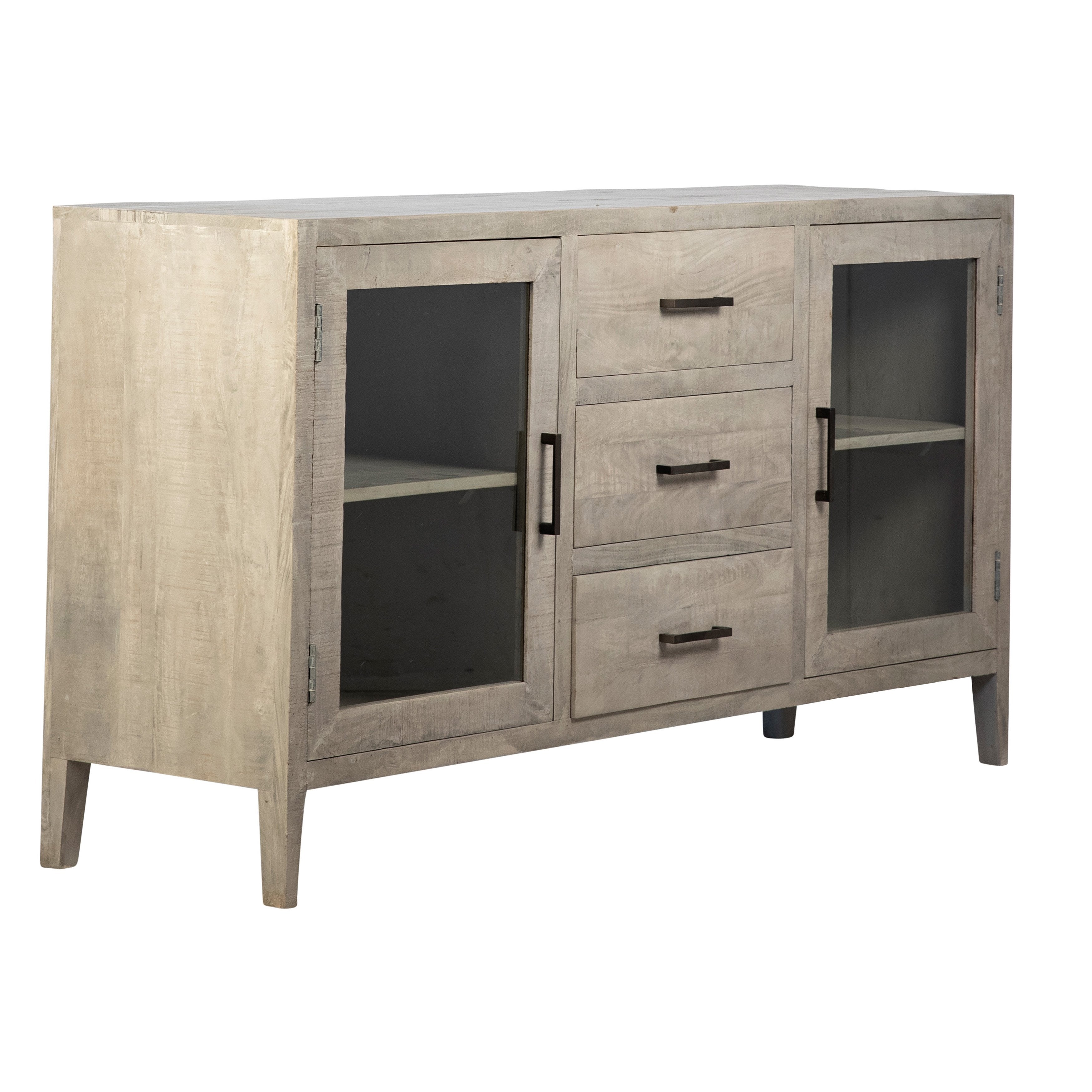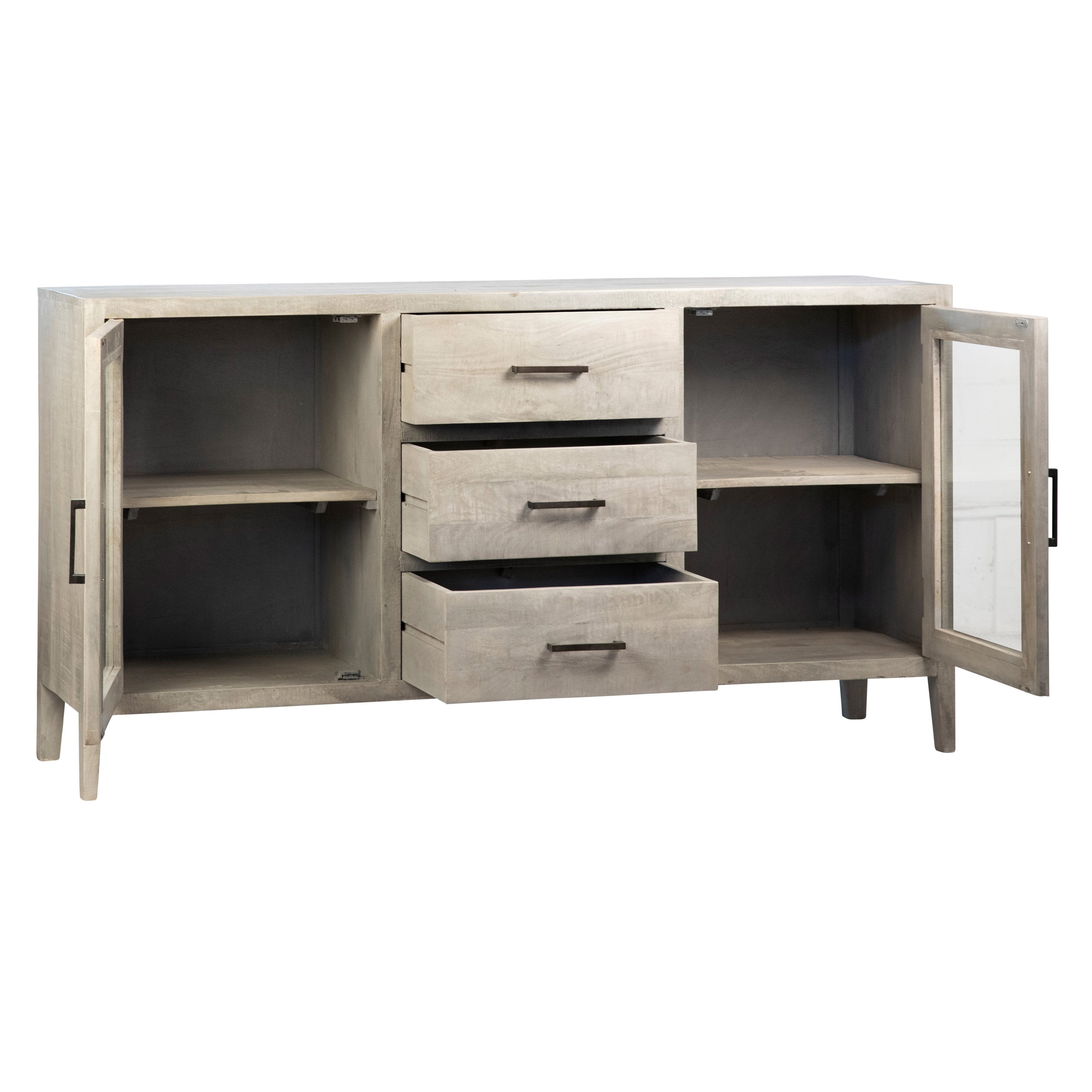 This 68 long sideboard features a classic design, solid acacia wood construction, and a light grey wash to create a timeless look. Two side wood-framed glass doors open to a built-in shelf that is perfect for display. Three vertically stacked drawers run down the center for maximum storage. Suitable for both home and office, the simple design of this piece complements any style of space while keeping the focus on your admired display.